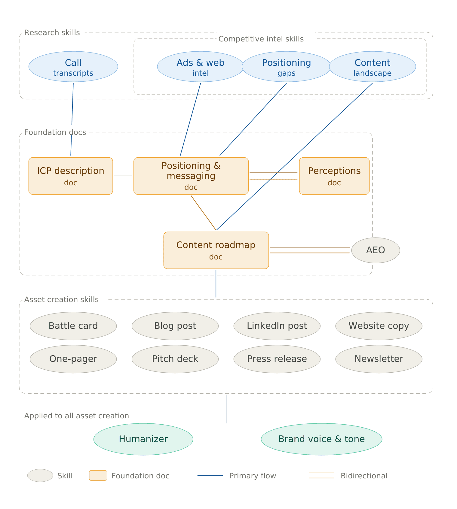 The practical effect is that when our direct engagement with a company winds down, the founder or head of product can continue producing marketing work that's on-strategy and on-voice without needing to be a marketer themselves. They don't need to remember the positioning nuances or guess at tone. The system encodes that context and applies it.